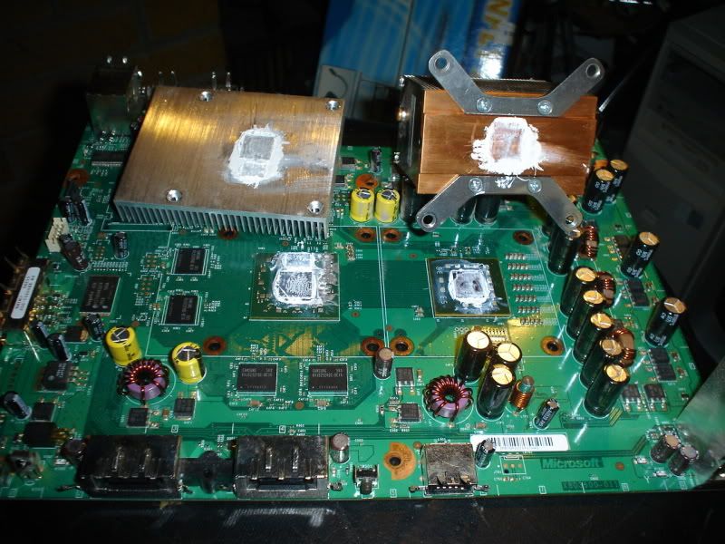 The frustration didn't end there, I flipped over the xbox and noticed the xclamps have been replaced with the short screw xclamp replacement method. Taking the heatsinks off i found about a whole 3 gram tube of thermal paste.....