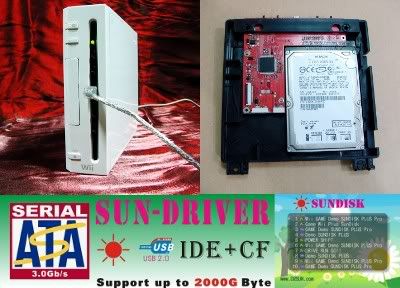 The team behind D2SUN has announced a new interesting product which replaces the Wii DVD drive with an enclosed 2.5" SATA HD interface and USB 2.0 port. There is also an optional 2-in-1 version with ATA HD interface and CF card slot. SUNDRIVER supports all current consoles including the latest ones with D3-2 drive and 4.2J firmware. Installed games can be selected using three different methods; either by using switch on the front panel (disc slot), from PC via USB 2.0 interface or by using a GameCube controller from Wii disc menu. Check the official site for more info.