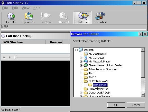 Finally, under "Target Device" go to "Select backup target " once there, select your burner, If you have 2 burners, select one. Where it says "Select folder for temporary files", "Browse" until you find your created folder for your backup and click, "Save". That's it! Click "OK" and DVD Shrink burns that DVD to your HD. It then opens Nero and has it burn the files to your waiting blank DVD.
