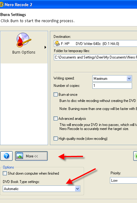 My burner doesn't support booktyping DVD ROM, so it doesn't offer the option. I selected Options, but those are limited. Note the difference in this window and the one in the instructions above.