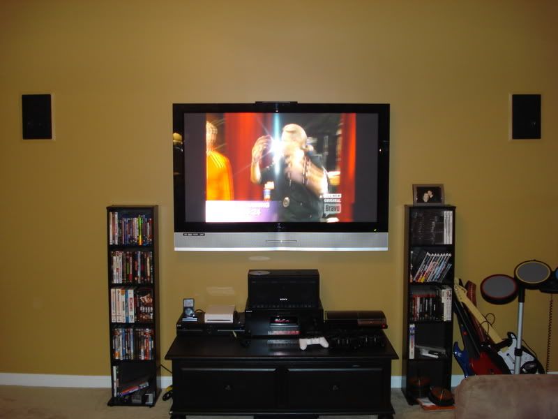 after four months ive finally finished my setup so here are the "present" pics. page 3 has the past. Things I have added are surround sound, notice the in wall speakers, theyre on the other walls as well, HD directv box, and the ipod digital media port which is awesome because I can use the sony receiver remote to control to Ipod.