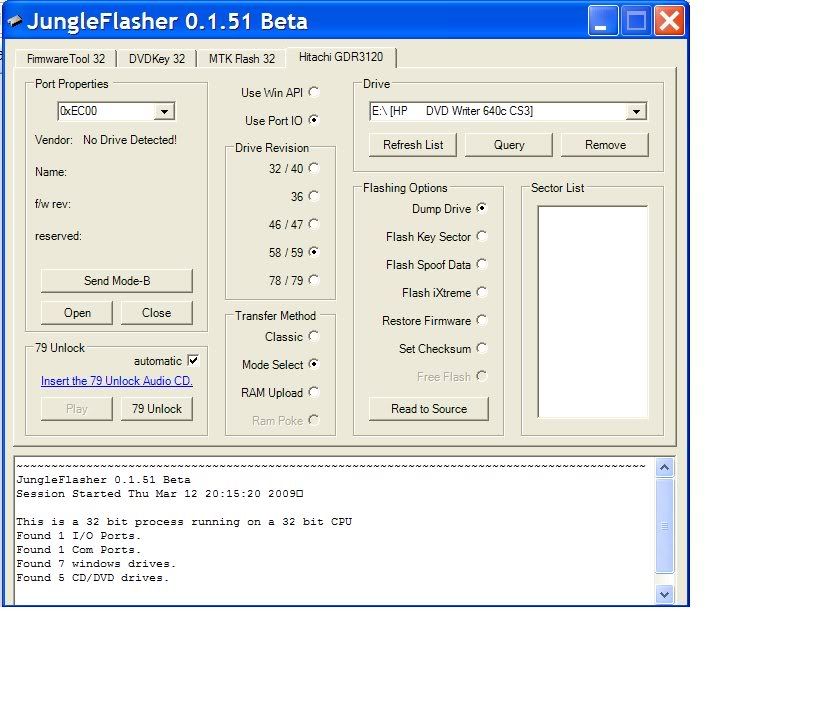 You have some settings wrong for a Hitachi 59. Put a tick in RAM UPLOAD, and try the WINAPI, make sure you select the correct drive in the drop down list plus make damn sure you're using the correct port.